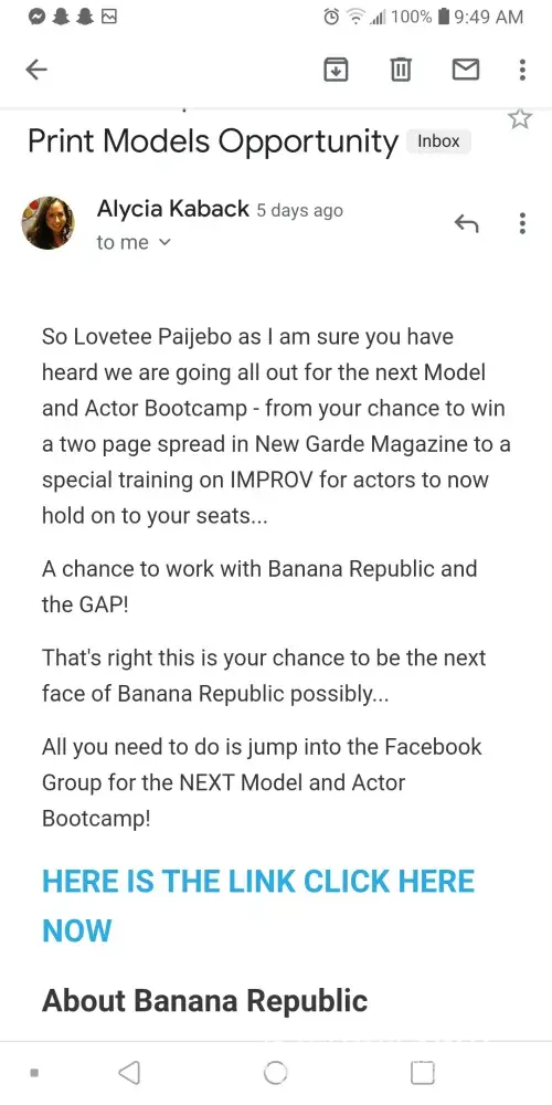 After she sent thousand of emails about an webinar about an interview I joined and she went on and on like she's a salesman which is hilarious because I work in sales! She stated they had an event in April that was not sponsored and we had to pay at our own expense with a credit card. Then she proceeded to take question she was so rude and told me my question was dumb and after I ask so how would their company benefit us she state she was going to log me off! They are not legit I been on Top model and I am well aware of scams and unauthorized agency and if they legit they're going to invest money in you this is a SCAM to get YOUR MONEY!