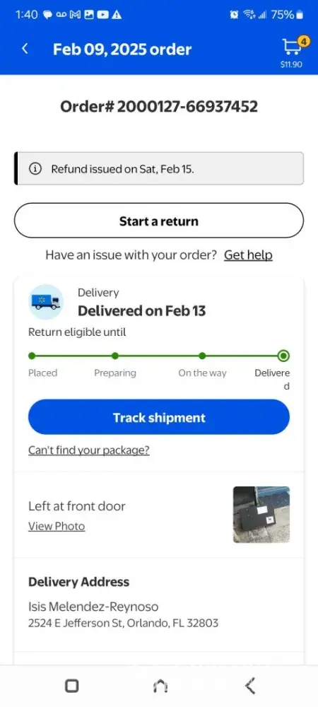 Purchased a laptop from vip outlet via walmart app... I never received my item as it delivered to some unknown address on my street. It was left by a blk folding chair and a picture was taken of it and posted. I walked up and down my street looking for where it was placed and was unsuccessful. I contacted walmart, who told me that they would contact the...