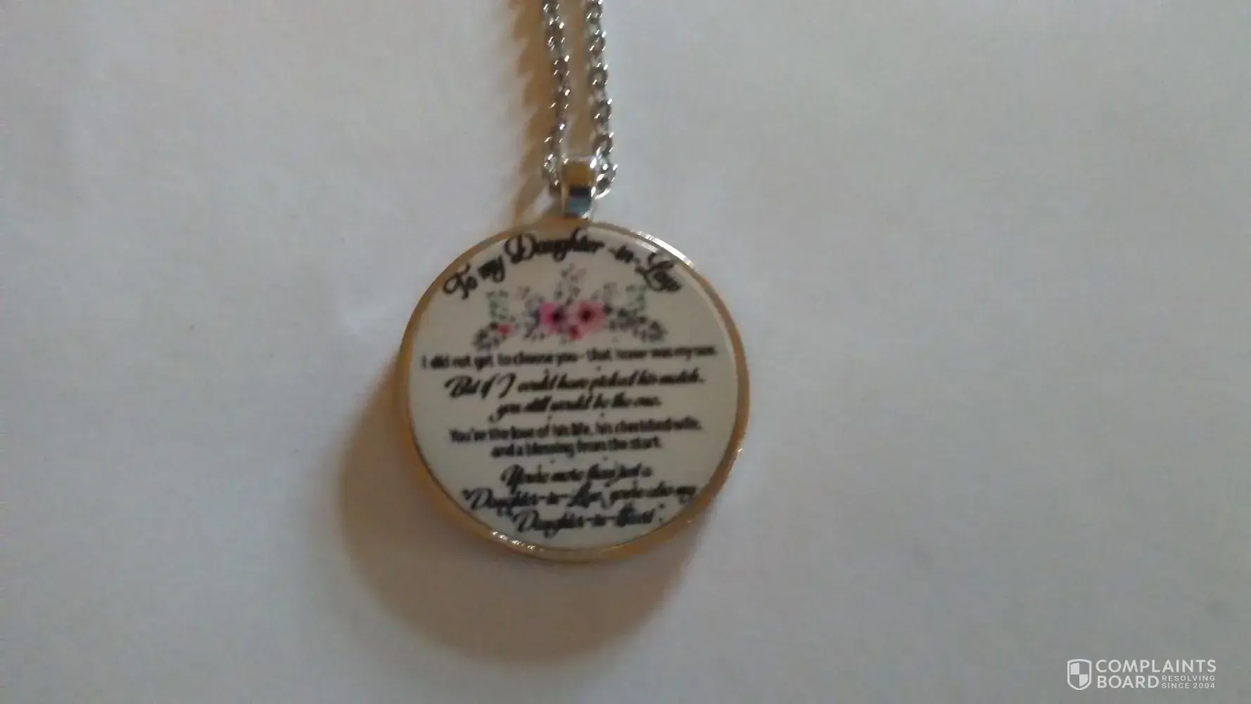 I bought a daughter-in-law necklace.recieved it, ani have triedd it is not as big as a quarter.i tried reading it with glasses and a magnifer, still can't read it.it is very poor quality of work.i have tried too reach them, all I get is a voice mail with no call back.did this 3 times.chatted with someone about 3 days ago, was told to send pictures, did that still no responce.i want to send it back and get a refund I don't want to call my credit card company, but seems like I will have too.all I want is to be treated like a paying customer.thank you very much.
