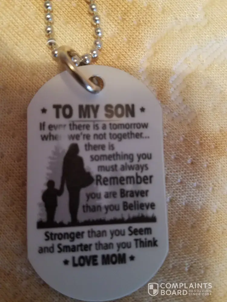 I ordered 2 dog tag necklaces for Christmas. They were over 30$ each. Received cheap plastic things that a child would purchase out of a gum ball machine. I am dissatisfied and want a refund for this garbage. I would never give these to my adult children. I have sent emails and called see how to return merchandise, however I'm being ignored. I want a refund but this company refuses to acknowledge me as a customer. Will have to file a complaint with my credit card company