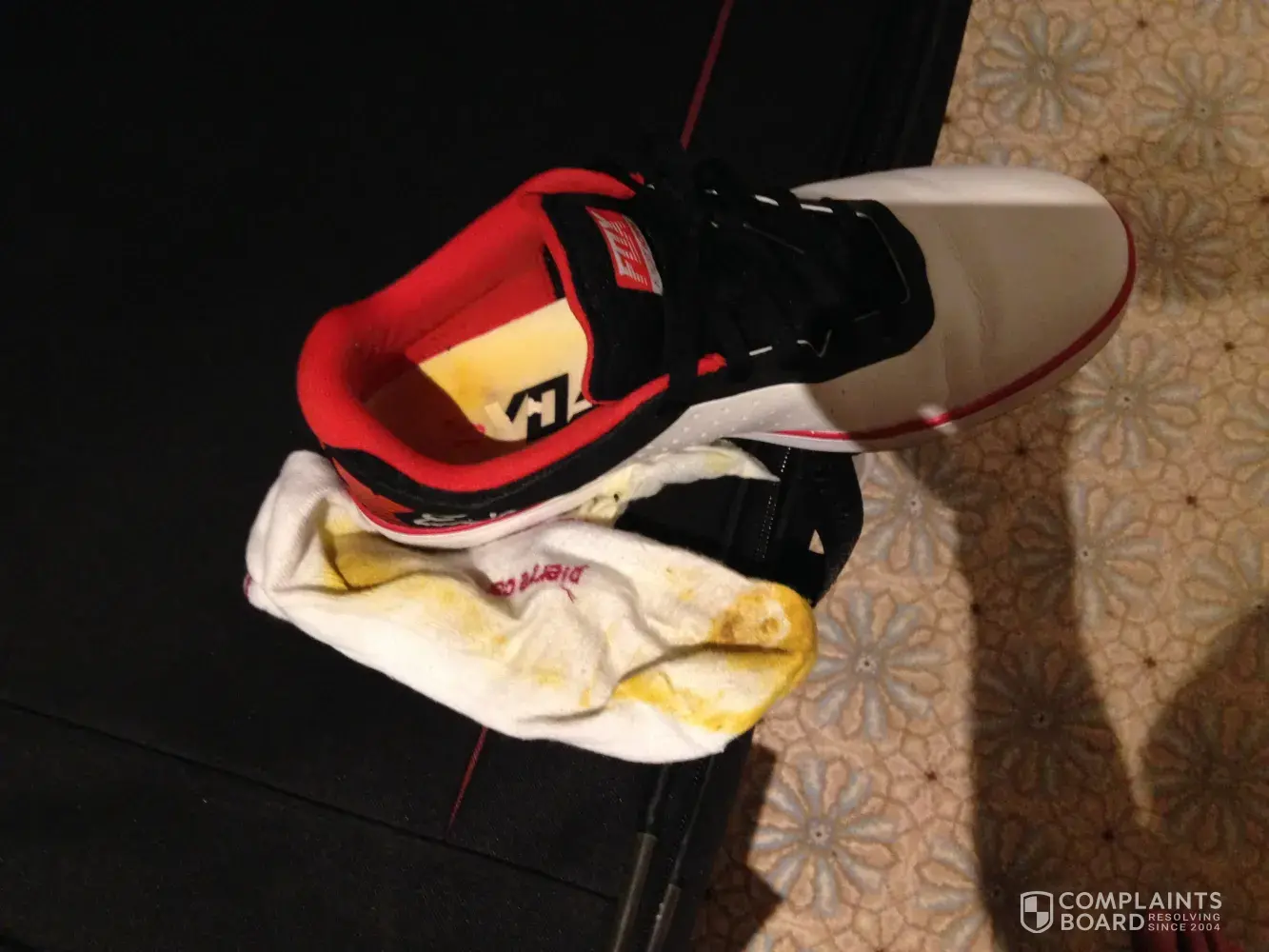 My wife and I travelled from Birmingham, UK to Dubai on Friday 17/09 for a vacation. On arrival at our hotel in the UAE I was absolutely appalled to see the filthy condition of one of my socks and stained shoe caused supposedly by the filthy floor of my seat!? The attached pictures show the heavy Yellow stains which could only be caused during the flight as both my shoes & socks were brand new and only taken off whilst seated!