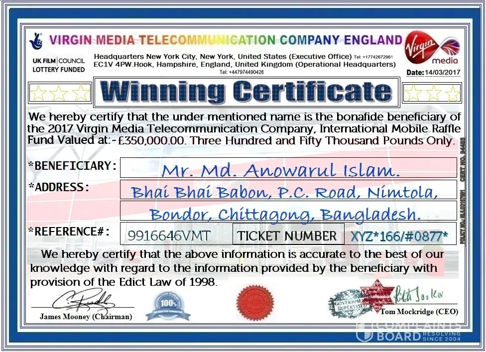 Good day, sir/madam. I received followings 3 emails, where your good bank has been affiliated. (1) fund release claim proceeding (046-vmt) inbox vergin media telecommunication uk fri, jan 8, 2016 at 4:34 pm to: "r.C. Oronno" reply | reply to all | forward | print | delete | show original virgin media telecommunication company england headquarters new york city, new york, united states (Executive office) ec1v 4pw. Hook, hampshire, england, united kingdom (Operational headquarters) = dear winner. We acknowledge the receipt of your e-mail regarding your winning notification from the virgin media telecommunication united kingdom for the 2016 virgin media telecommunication anniversary draw. The europe/america / asia private international e-games are pleased to inform you of the result of the final concluded draws which was conducted at our international corporate office complex here in england, by the virgin media telecommunication in conjunction with I pod worldwide promotion. Your mobile number was among of the lucky winners who has won (₤950, 000.00 great british pounds) nine hundred and fifty thousand great british pounds only in the virgin media telecommunication company united kingdom for the 2016 online mobile promo offer. This program is titled 25th anniversary virgin media telecommunication mobile award 2016. Virgin media telecommunication company is given out this promotion award to difference individual in difference part of the world for the use of virgin media communication company united kingdom, and for the help of advertising of the virgin media network company. We use this opportunity to advert our company in worldwide and for the celebration of being one of the successful networks in the world. However the results were released and the notice was also sent to your mobile number. This draw is being organized to enhance awareness and publicity of the virgin media product such as phones, lap-top, camera, lcd, virgin tv, apple I pad virgin media vision wireless, virgin media mobile communication, and etc. The foundation also seeks to courage the use of internet for academic and business pursuits. It major aim is to promote music, theater, art, literature, projects in the social and political arena with a focus on health, as well as science, research and higher education. The virgin media telecommunication company ltd england is glad to inform you that you have been approved a lump sum pay of (₤950, 000.00) nine hundred and fifty thousand great british pounds only in cash credit ref no: 046-vmt. From the total cash prize of (₤1, 900, 000.00) great british pounds shared among two lucky winners in this category. You will receive this fund by telegraphic transfer [bank wire] once again we have confirmed your email with regard to the winning notification as earlier sent to your mobile number all participants were selected randomly from world wide mobile directories. To celebrate the virgin media international promo/ xmas offer program, the virgin media company of england, in conjunction with tel-west and some multi national companies and other relevant bodies is giving out donation of {₤1, 900, 000.00) great british pounds} to the two lucky recipients to receive each (₤950, 000.00 great british pounds) in the two lucky recipients. The 2016 anniversary of virgin media telecommunication company ltd england, international mobile number award is no doubt, a momentous achievement in the chequered history of this corporation. On behalf of the entire staff of the organization, I wish to congratulate all non-governmental organizations who have in no little way contributed immensely towards the success of this draws as well as taking concrete steps towards its actualization. These specific donations/grants will be awarded to recipients worldwide, in different categories for their personal business development and enhancement of their educational plans. Kindly note that you will only be chosen to receive the promo offer once, which means that subsequent promo offer donation will not get to you again. This lottery is approved by the united kingdom lottery board organization and also licensed by the international association of gaming regulators (Iagr). This lottery is of its kind and we intend to sensitize the public. You are selected among the two lucky recipients to receive the anniversary award sum of ₤950, 000.00 great british pounds in total funds of (₤1, 900, 000.00) great british pounds as virgin media company ltd united kingdom promo offer donations/aid from the virgin media company of england in accordance with the enabling act of parliament. You are required to complete the below application form and send it to nat-west bank plc uk immediately so that they shall start the processing of your winning formalities and approved your winning prize for transferring according to the approval of the uk lottery organization (U.L. O) england. We advise you to contact the nat-west bank plc uk immediately through via email ([protected]@accountant.com) this mobile draw it's open to virgin media employees or contractors, or their family and friends. You are warned to keep your winning information secretly to yourself until your fund is released to you to avoid double claim which will lead to absolute cancellation/termination of award. Note: the following reference numbers has been assigned to you and you are required to quote it in every mail you sent regarding your winning prize funds: 046-vmt.. Below is the contact information of nat-west bank plc uk. The director operations and remittance nat-west bank plc foreign remittance department united kingdom. Email: [protected]@accountant.com respected sir / madam. Application for fund release virgin media telecommunication company england ref no: 046-vmt. I am (Mr./miss) I write to apply for the release of my fund with regards to the winning notification that was received on my mobile number from the virgin media telecommunication company 