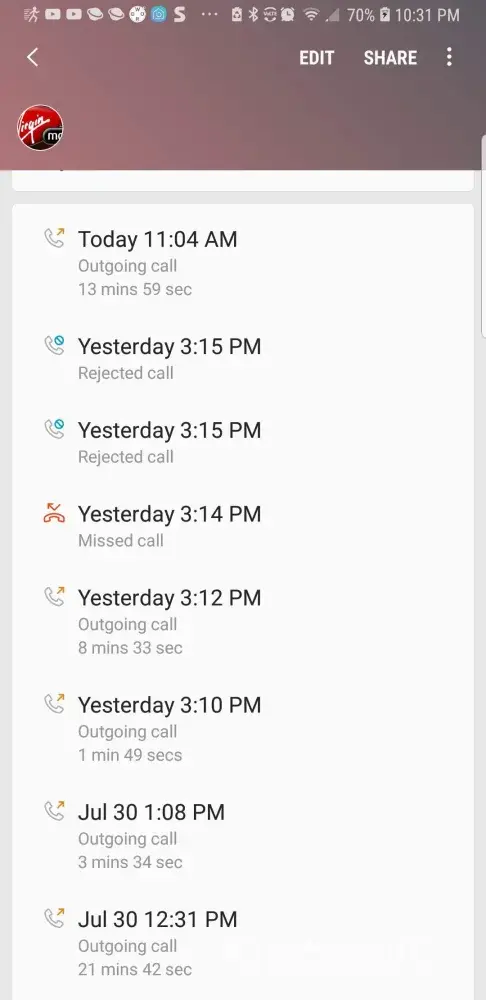 Photos attached show the call history to Virgin Mobile. Added the screenshot of the Sprint call which was used for 3 way calling. Shows 1 hour 43 minutes total. I would have included a copy of the 3 hour chat session with Sprint but that file is too big to upload. Talk about a waste of time.