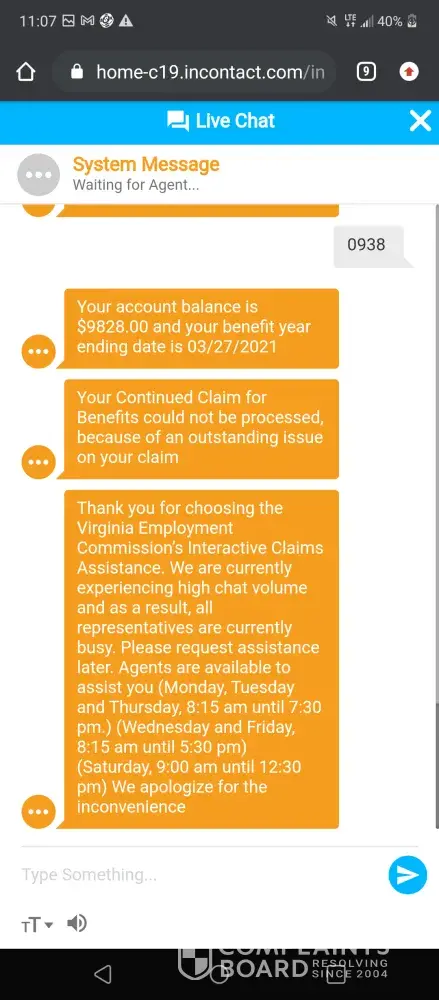 I cannot reach anyone on the customer service phone line, live chat or email. I have been waiting and trying to obtain info about my claim since September. As well as at least 80, 000 of us have been denied or waiting for deputy decisions on claims. They had since March to get this right and now it is a week before Christmas and still nothing. They need to release our benefits immediately! People are suffering losing utilities, homes because of the VEC's poor handling of REAL people's claims. A class action lawsuit should be effected against the VEC and lawmakers that have done nothing more than write letters to intervine and help struggling Virginians.