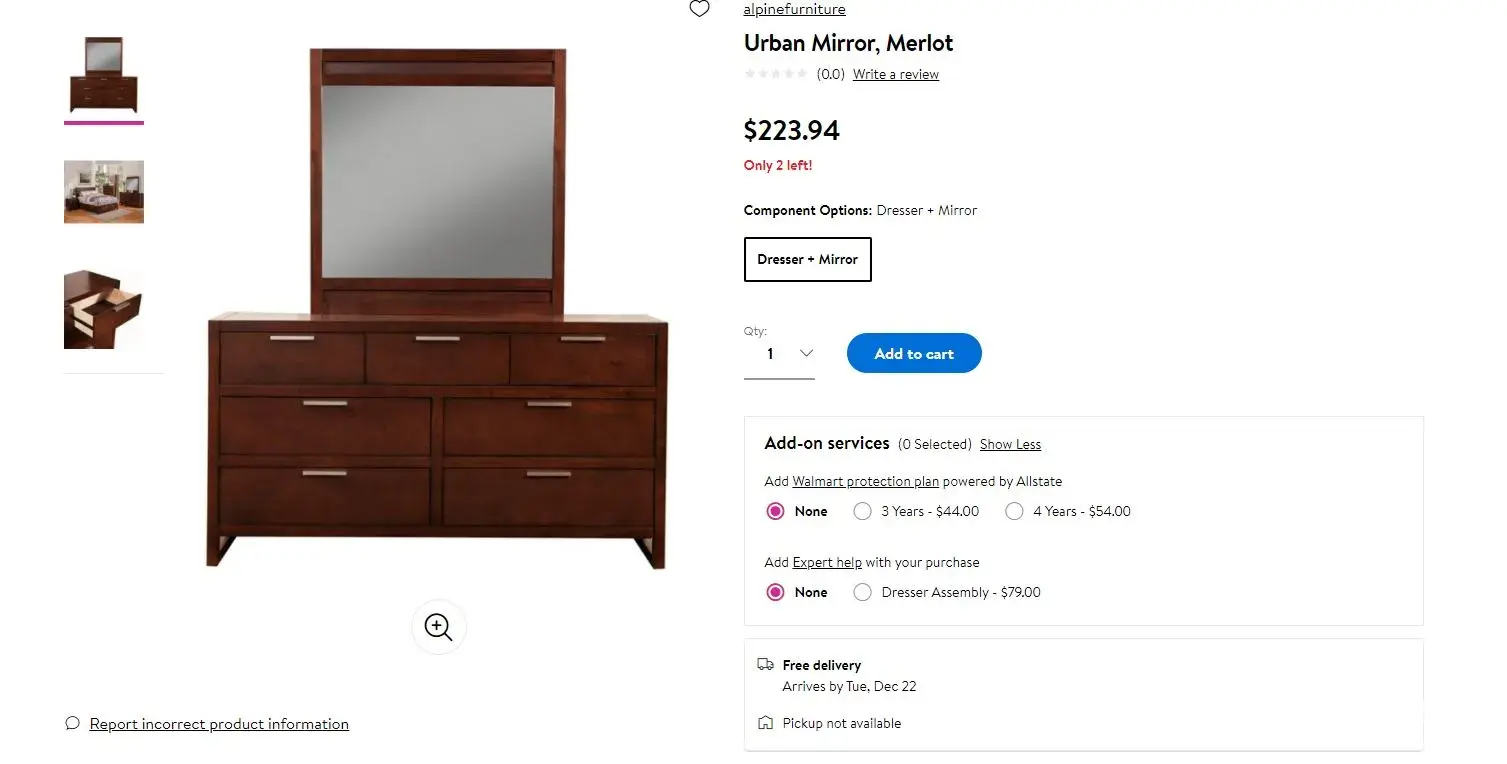 I ordered a dresser and mirror... Received only the mirror - they claim that I didn't order both, but when I went back on the website, the mirror alone was less. I am attaching a snap shot of the website that shows the dresser and mirror. Anyway, I returned the mirror and they refuse to return my $223.94 because they received it back broken... I never even opened the box... So I did not even know it was damaged. But either way, that is on them as I would have returned the damaged item anyway.