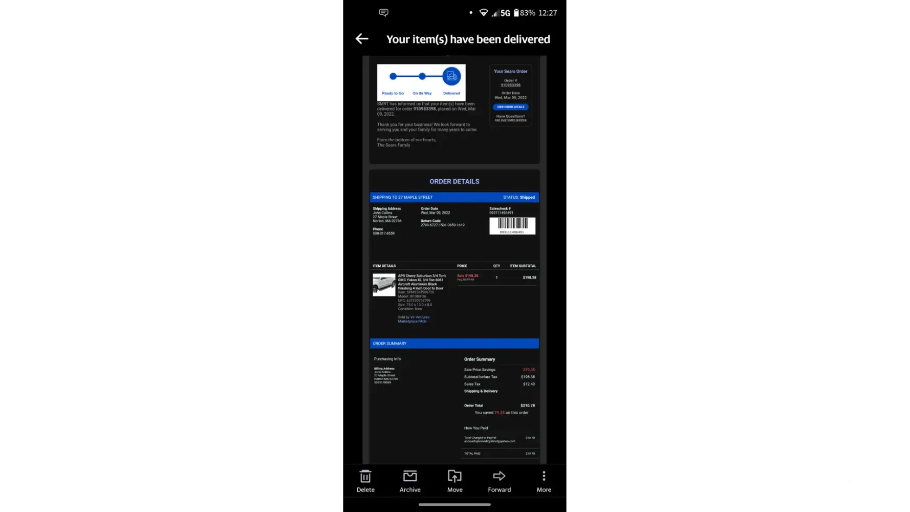 It was paid in full with my credit card. On June 15, I received 1 box of 3 for the bed frame wit the following email record :