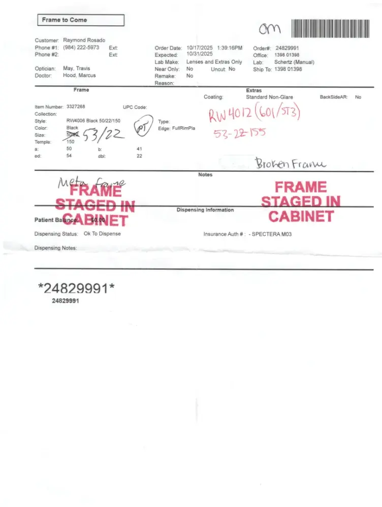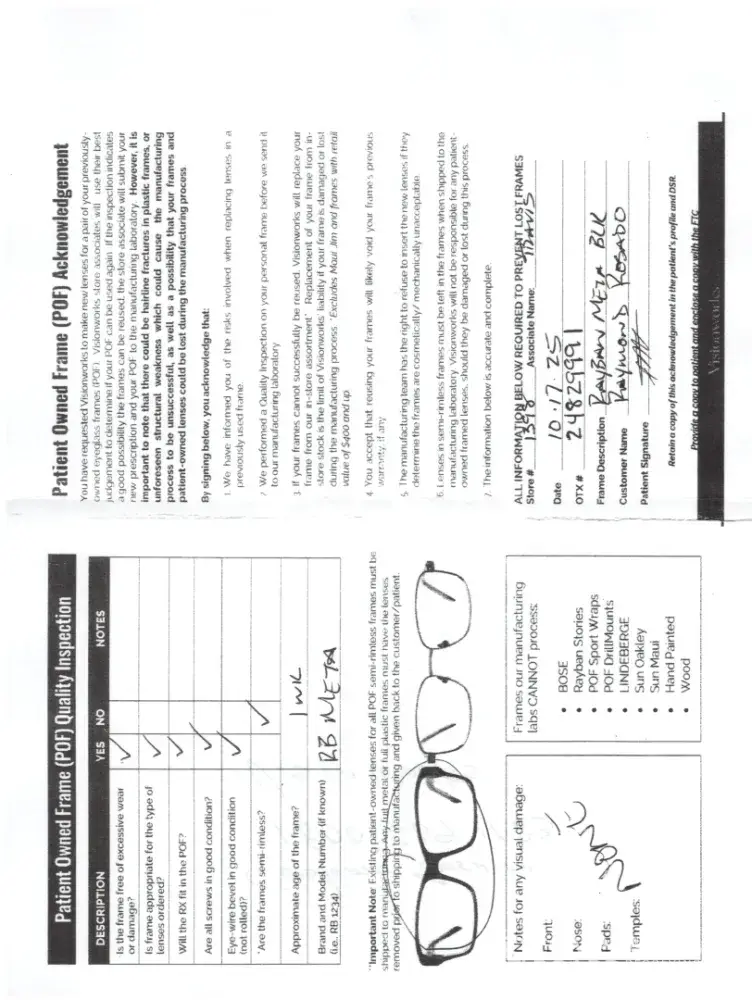 I gave them my glasses to do my prescription lenses, they broke my frame. They void my warranty because they said I sign a paper where they are not responsible what happens with the frames about broken, stolen or lost, they will replace the frames with one of the store but not the ones they broke. I'm going to file a complaint with BBB.I bought The Meta Gen 2 Rayban Glasses and I went to vision works to do my prescription for them and they broke my frame in the process i sended the photos to you where the frame was broken and the order done there for the glasses. They gave me to chose a frame at the store and returned some money, but now i got a pair of broken f4rames that i cant replace and that I have to continue paying because i bought them with credit. Ray ban does not honored this because is out of the warranty
