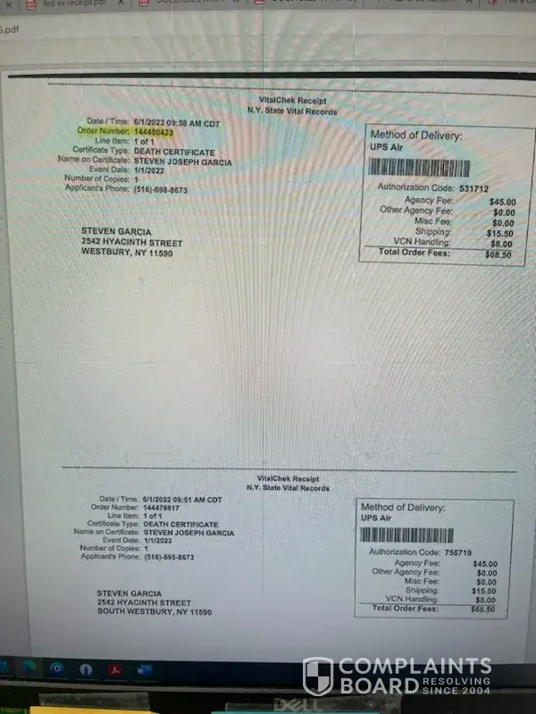Disappointing Experience with VitalChek: Delayed Certificates, Missing Documents, and Poor Customer Service