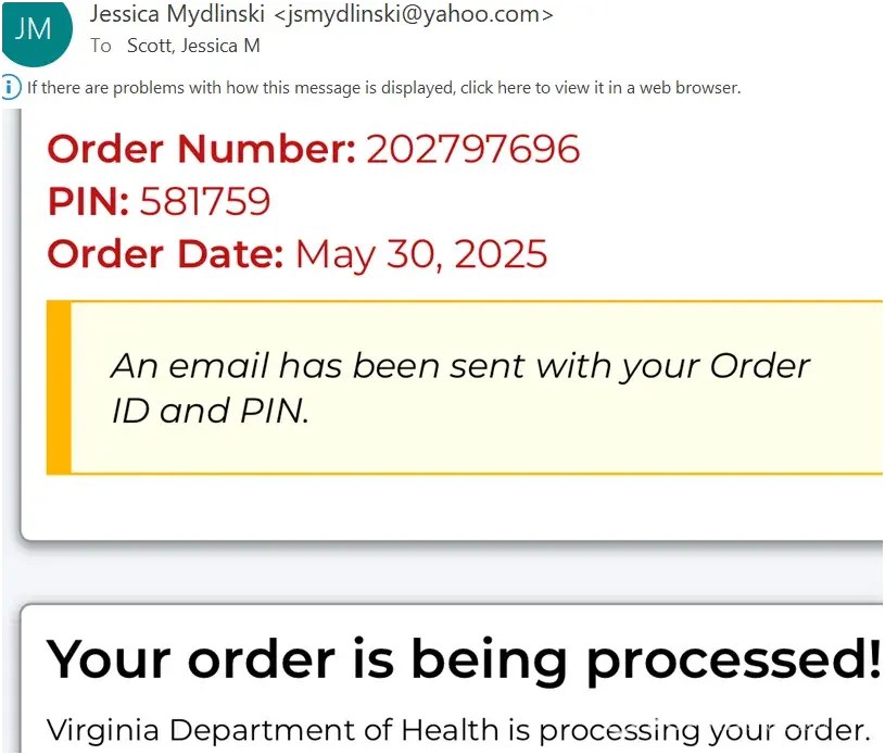 Order Date May, 30 2025 Order # 202797696 PIN 581759 Paid 93.85 for my order and for premium delivery. What is going on? I want my order. I am dissapointed. You already cost my my summer 2025 trip due to your inability to do your job and get me my 3 certificates that I paid for. Jessica Scott 10-20-1977 Born at George Washinton hospital Washington, DC