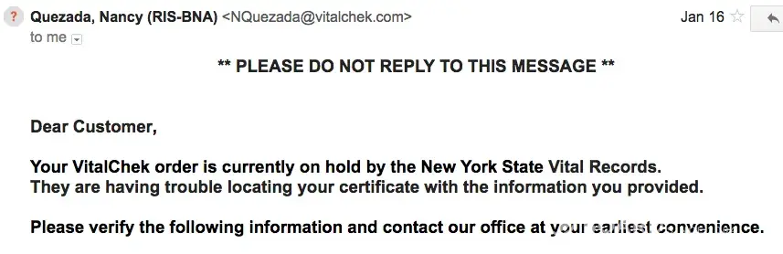 On Nov. 18, 2015 sent in request to Vital Chek through government website to order a copy of my birth certificate. I had to give some information along with my email address. I gave the address several times even spelling it using words to make sure the letters were interpreted the correct way. Two weeks later on Dec. 3, I contacted them and I was informed I had been sent an email telling me my drivers license was clear enough. I tried to complain that I had even spelled out my address but that was no concern to them and they said just take a picture your license and send it through that way. So I did. Its now Jan. 4, 2016 and just got off the phone and was informed by Rose that it has been sent to the agency? whatever she was talking about but I should receive it within the next week and if not by Monday Jan 11 to contact them back. Now I understand the 7-15 day time they give to receive a certificate but I was told by Rose today that starts the day the finish the order and send it out. So that doesn't count holidays or weekends so from Dec. 14 is when she said it closed out, until Jan. 11th makes 15 days. I told her I'm just glad my life didn't depend upon receiving it in a timely manner
