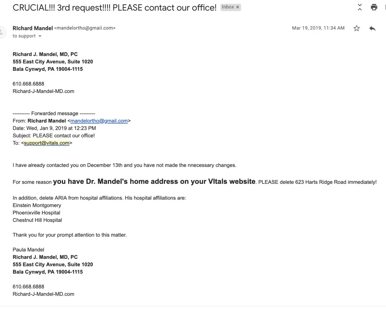 Vitals.com ha erroneously posted the home address for RIchard J Mandel, MD as one of his office addresses. I have written to their customer service dept per their website, 4 times now and have not received an answer or corrections.