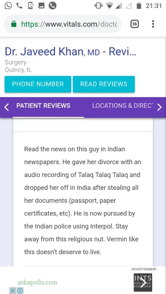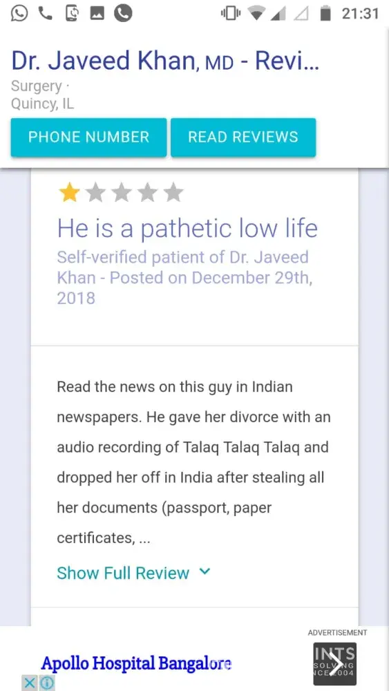 I am Dr. Javeed Khan, a general surgeon who was working in Quincy, IL. Some one posted a false and a very malicious content about me on Dec 29th 2018. The heading was "He is a pathetic low life"...religious nut and vermin like him doesnot deserve to live...