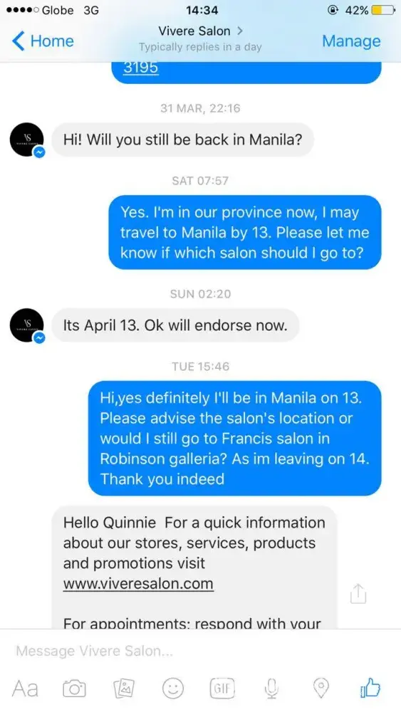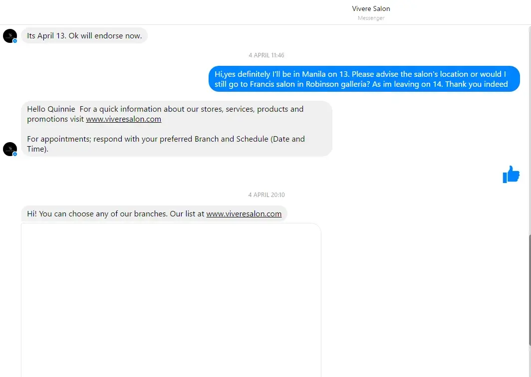 Vivere salon already settled my concern. Thanks for your immediate response to my case. :)