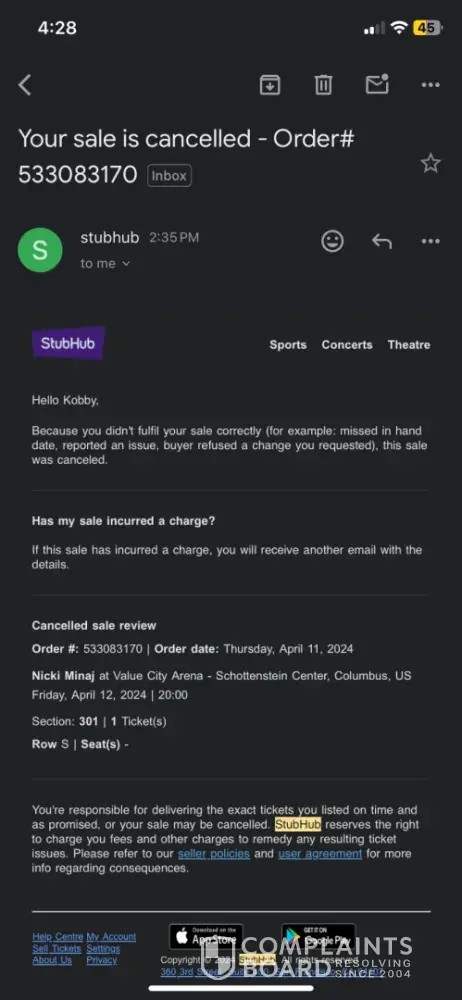 We purchased tickets for my daughter's 12th birthday well in advance for a highly anticipated concert. We were expecting the tickets to arrive the day before the event, scheduled for May 6, and had received an email confirming our seats in the chosen section. The total cost for two tickets was substantial. However, on the day of the concert, we discovered that the seller, operating through a third-party platform, had sold our tickets to someone offering a higher price. The platform's only compensation was to offer us seats with an obstructed view behind the stage for the same amount we had paid for prime lower-level seats, or they proposed a full refund. I insisted on getting the seats we originally selected, but they refused, presenting us with a take-it-or-leave-it ultimatum. Understandably, I was distraught, especially after a four-hour drive with the expectation of enjoying the concert from our chosen seats. The situation escalated when the representative threatened to end the call and subsequently hung up on me as I was pressing for a better resolution. I strongly advise against using this service for ticket purchases.