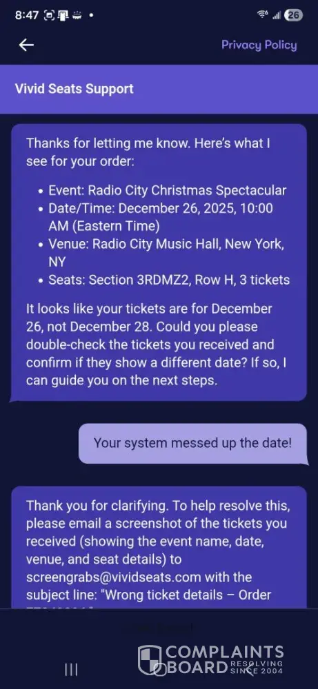 The date I selected for purchase was 12/28/25. The date got changed by the system to 12/26/25 which made the tickets unusable. Paid $367 for 3 tickets. Customer support was no help and refused a refund or to send the tickets with the right date. My order # 77243096 Vivid seats needs to take ownership and make this right. Right now I paid the $367 and didn't even get to take the show in.