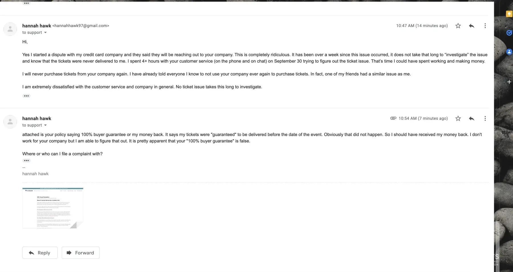 I had ordered tickets for a sporting event. It was the day of the event and my tickets were still not available on my account. I sat on the phone and chat with Vivid Seats customer service for 4+ hours on the day of the event. The tickets were still never delivered to me. I reached out to support the night of the event (after the event was over) asking for a refund, following their "100% Buyer Guarantee" policy, and still never received a refund and it has been over a week now. Every email I sent, they would reply saying "it is still being investigated." They said they would send me a form to fill out, they never sent the form (no surprise) and then told me it (again) has to be investigated. I finally decided to dispute the charge on my credit card so now my credit card company has been reaching out to them to figure out the issue (even though it is a simple and obvious issue).