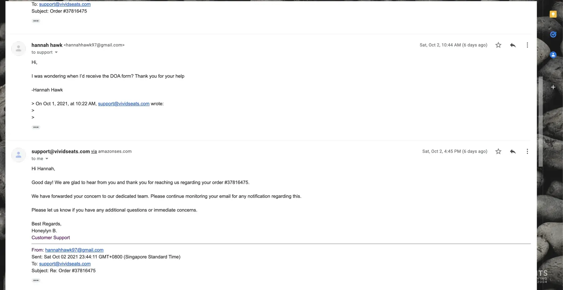Ordered tickets for new orleans saints nfl game against dallas cowboys on may 26, 2021 and received a text stating that the seller has transferred the tickets to my email on 6/1/2021 which I never received the e mail so that the tickets could be transferred to my account. Have reached out to customber service at least 10 times and been getting the run around they said they would get the seller to retransfer my tickets and that have not happened so far but they was paid on the 5/27/21. Would like to hear from vivid seats to make sure that I will receive tickets before the game, or have them retransfer the tickets so I can have a piece of mind