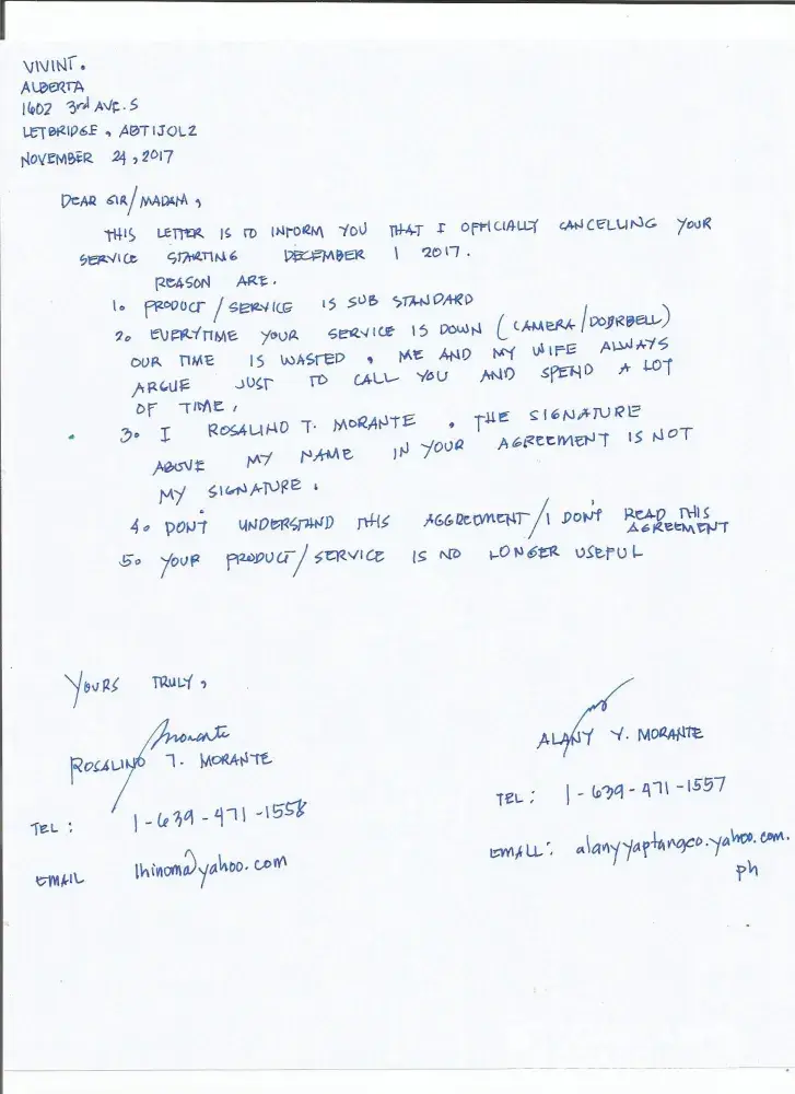 May 21 2016 me and wife alany morante signed there so called agreement on the tablet of the sales agent, not fully understand that we can cancel there service, I rosalino morante, above my name on that so called policy is not my signature.