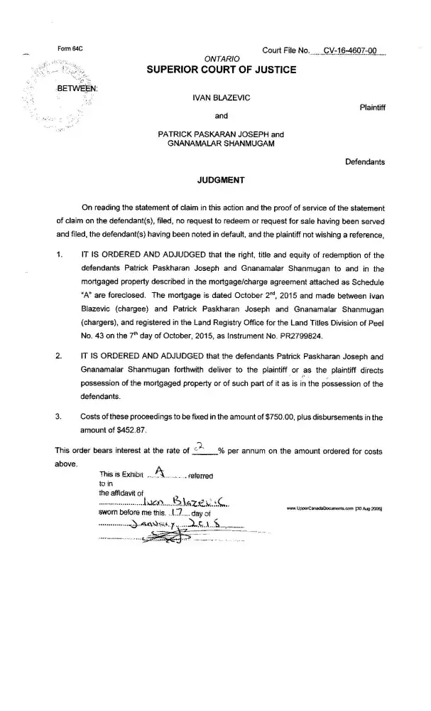 Who came to borrow the money from Mr.Thiru’s Investor? Patrick Paskaran Joseph, NOT OTHER WAY AROUND. The Lender gave $100, 000.00 as a second mortgage, the borrower’s received the 2nd mortgage advance money through the borrowers lawyers, with one-year open term at 12% was advance on October 02/2015; Patrick Paskaran Joseph gave his personal cheques for the mortgage payment, most of them returned as NSF (No sufficient funds in the account), the borrowers only paid 4months payment. After several collection calls and meetings with Mr.Patrick. After 6months of Non-payment of mortgage, Lender’s lawyer proceeded with a legal action. These people haven’t followed the Canadian mortgage contract law and pay their mortgage loan as per the loan agreement and charge; Lender has followed the Canadian legal system & the law and obtained a Judgment on March 07/2017. The borrowers and their lawyer defended this action, both Patrick Paskaran Joseph and Gnanamalar Shanmugam lied & testified at the Court. The borrowers appealed to the Superior Court and lost the case on March 05/2018. The Lender and Mr. Thiru have been very patient over 2years. The Owner has not paid property taxes, condo fees and kept the property full of garbage. It took 4 people to clean up for the whole day. Now, they have possession of the property jointly with Scotiabank and the subject property will be sold to recover lender’s money. Already, many people have seen it and putting an offer. The borrowers appeal to the Superior Court and lost the case on March 05/2018. As per lender’s lawyers investigation, on April 18th/2018 these both borrowers have filed Bankruptcy on or above 2017 to intentionally fraud the lenders of the subject property. It is very clear these borrower had a plan to defraud the lender, but Mr. Thiru, lender and lenders lawyer STOP this criminal act. It took us over 2 year of Non-payment. See the attached documents, you must encourage everyone to Not to miss a mortgage payment.