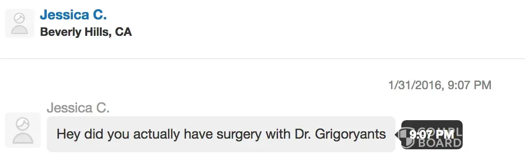 Please do not have surgery with Grigoryants. I hope that he gets punished for all his crimes. He has made millions off of poor patients. He lacks understanding of basic anatomy. All his negative reviews and evidence of criminal activity is hidden. Take a look at how many complaints he has on ripoff. If you google his name only 1 percent of the negative reviews show up. He has a ton of negative reviews.