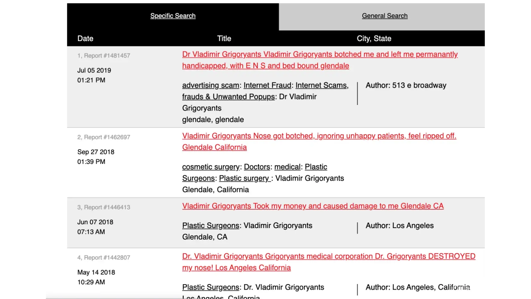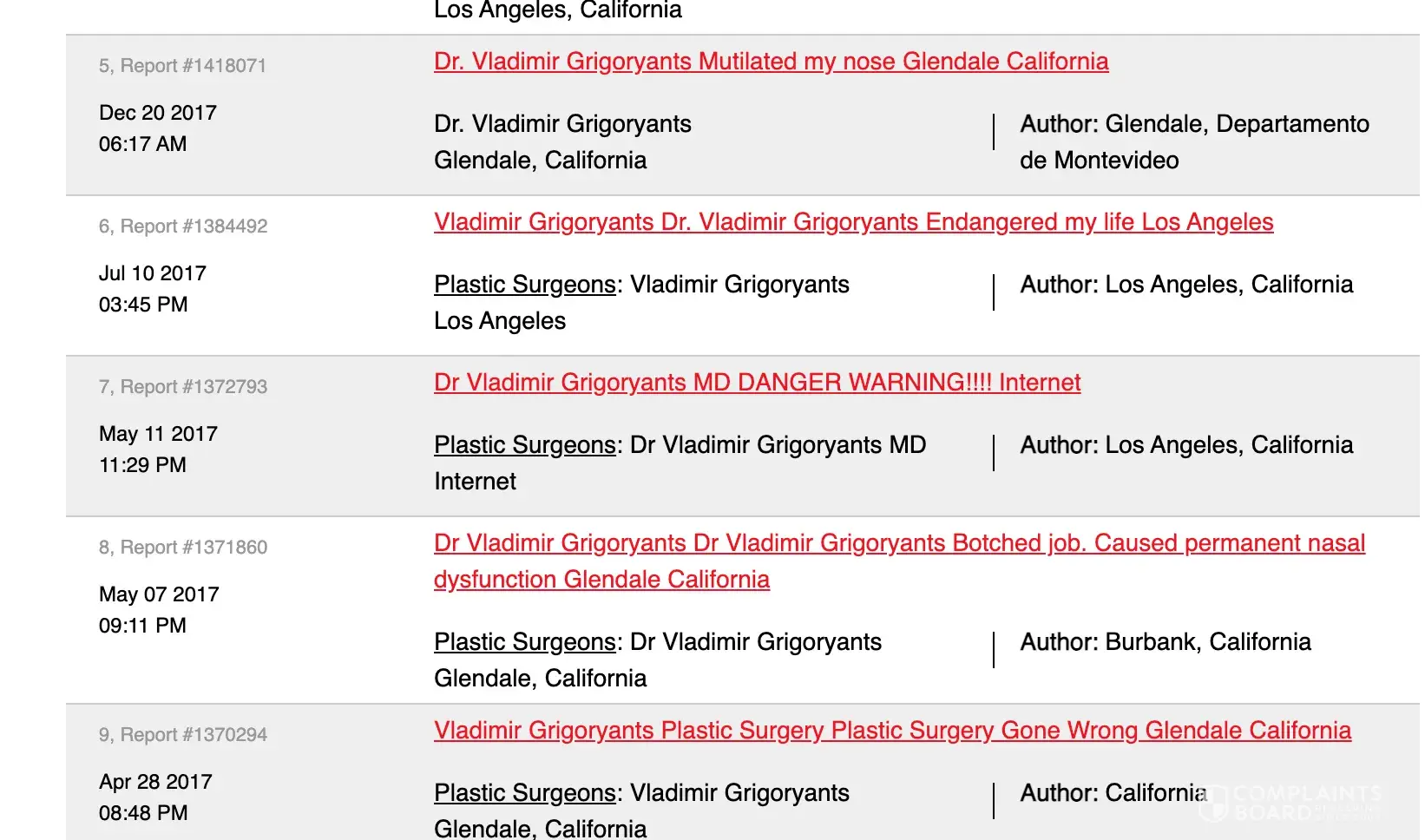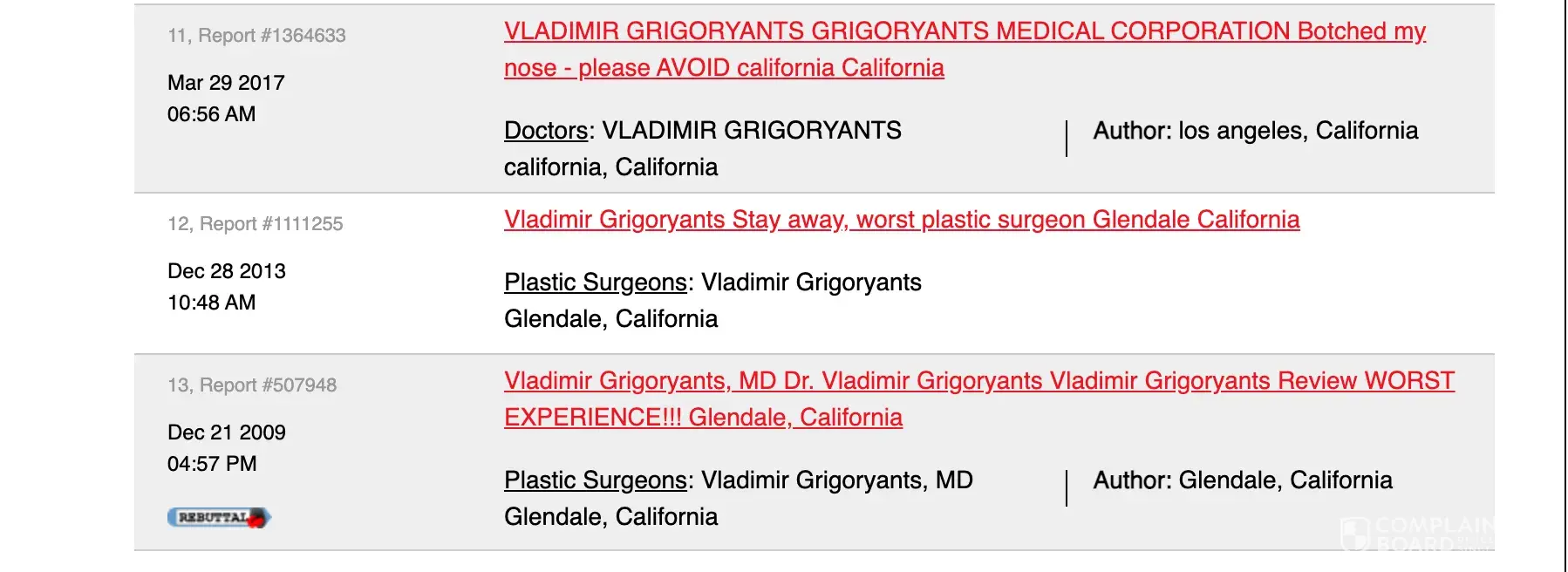Vladimir Grigoryants along with his family have no shame or skill. Their only skill likes in botching people, writing fake reviews and engaging in other fraudulent and unlawful behavior. All the well respected names in the industry know what he has been doing ever since he got his license. The California State Medical Board should periodically review the mental state of practitioners and restrict their privileges when there are serious incidents such as in the case of Vladimir Grigoryants. If you are thinking about any type of surgery it is best to go with a reputable doctor and do a thorough research. Vladimir Grigoryants ( this mentally unstable lunatic likes to have a review rating of over 4.5. If any of his victims leaves a negative review detailing their horrifying experiences, he goes bananas and gets their reviews removed using a paid service.