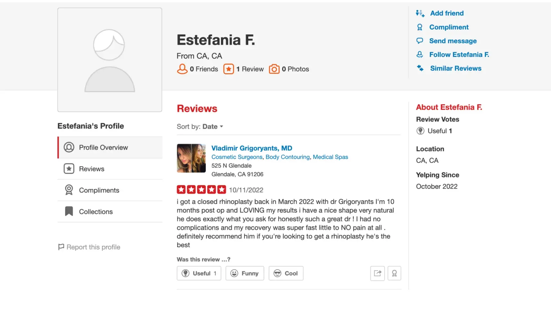 Here is a an example of a fake review written from Grigoryants and his team. Review left on 10/11/2022. Yelp profile created on 10/22