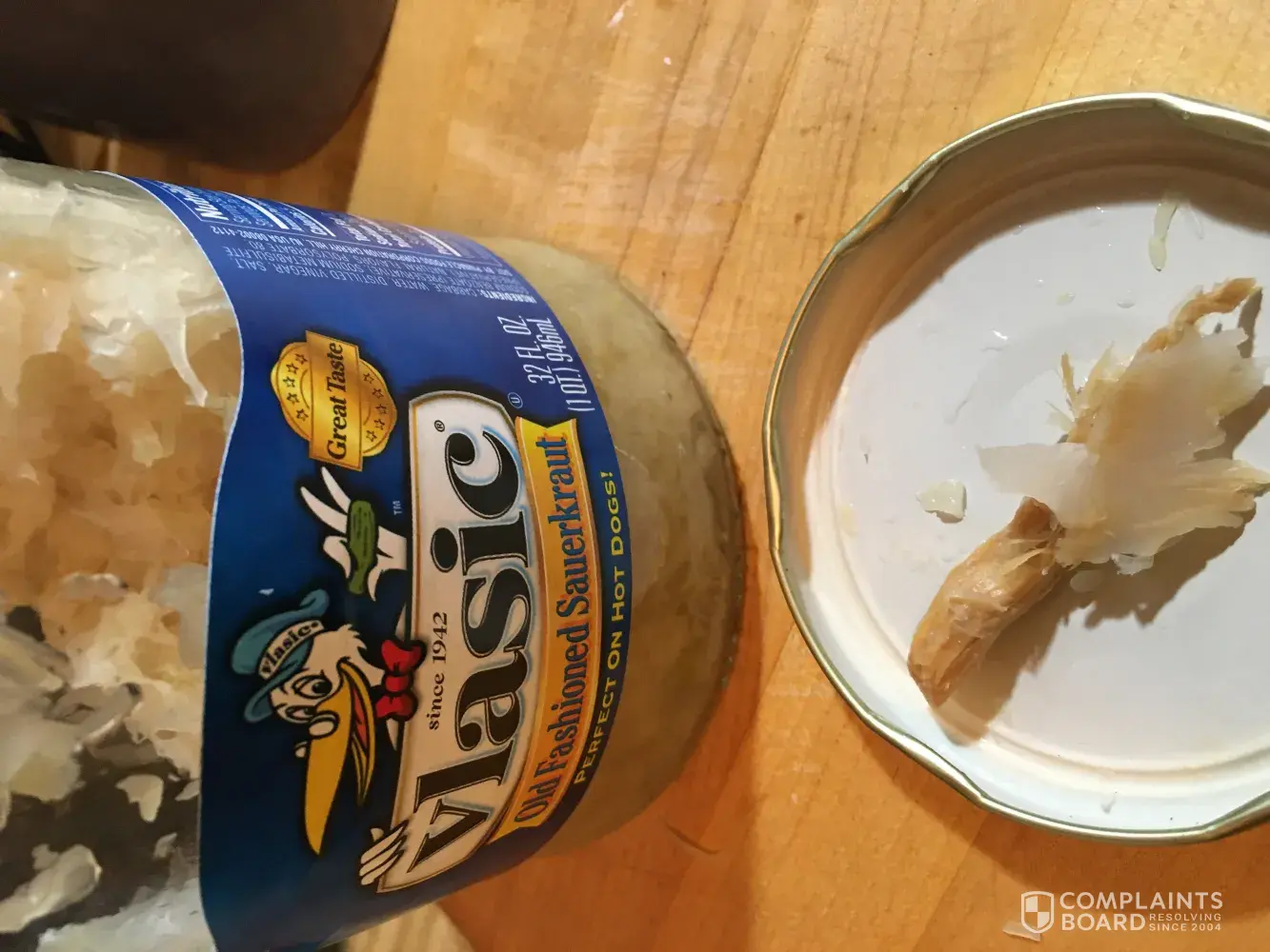 Opened a jar of sauerkraut and heated it up. Put some on a plate took a bit and found a chunk of wood in it. Do not ask me to send the piece of wood back with the jar of Vlasic Old fashion sauerkraut For I will not let this go over for many reasons. This could of harmed someone like choking or could have bit down and stuck in to the mouth or broken teeth. Will be contacting a lawyer and will get further assistance from them.