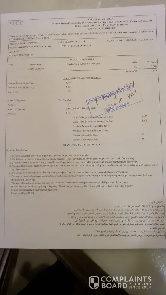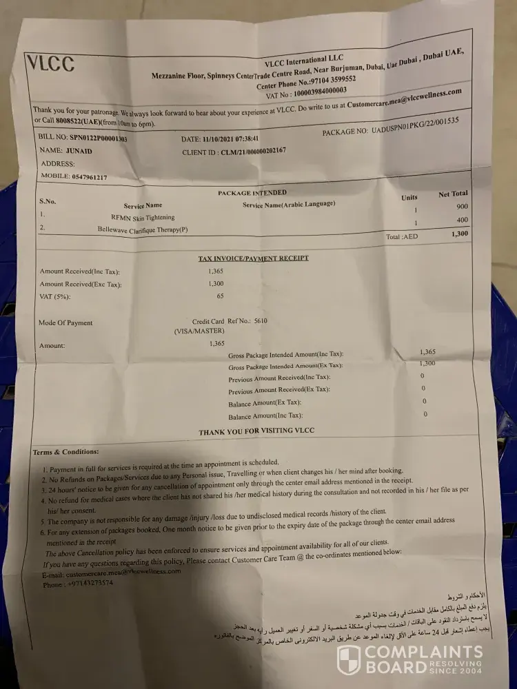 I have made an appointment on 12/10/2021 at vlcc Karama branch and I have made a booking for a treatment. I have paid 1365 aed for that, but unfortunately I am not able to attend the session as I have leaving the country on 15/10/2021, so I requested to cancel that and request for a refund . But they people is saying that everything is written on the invoice and we will not refund, I have came there the same day and begged for the return, cuz am leaving.