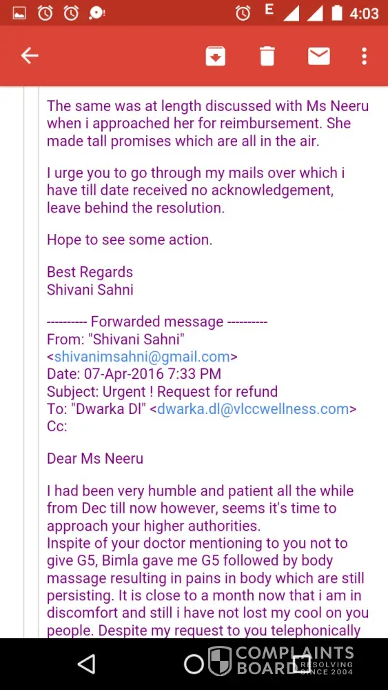 I am attaching few of the screenshots of my mails sent to Dwarka Sector 11 centre and the corporate office of VLCC for reference.