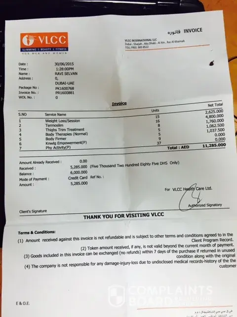 Hi, I had booked a trail meet with VLCC wellness at al Quasis branch and I had met the lady working with them and she explained everything about the scheme and later we came to the cost part wherein I said I have only come here for knowing the product and then she is like its a month end and you will loose the program so kindly pay some amount and later if you want we can always cancel it. I had agreed as I thought I shouldnt loose the program. After consulting with lots of friend I had finally agreed that I would not join so I called the next early morning and informed them that I would not want to join and now its been a week I am running for my money and the lady is saying that its mentioned in the invoice the money cant be refunded so sorry you have to use the money for any other stuff which is available with them. I am shocked to hear this from VLCC, lots of people did advice me about them that they cheat give lots of false promises and now I am one of the victim. I dont know what to do so kindly advice me what to do. I paid my money on the 30th of june and I called the next day to cancel. I have attached the invoice for your reference.