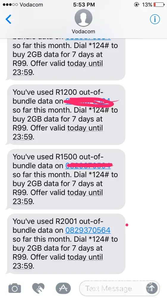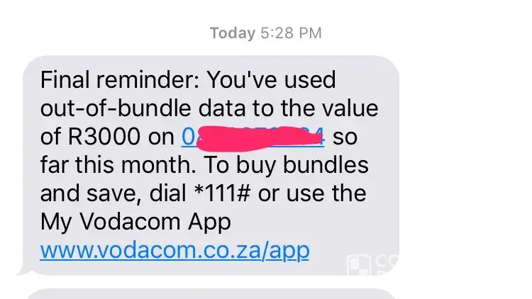 Luckily I was near a Vodacom shop and I ran in and while I was waiting the sms's keep on coming! Before I was helped it was R2100... the person who assisted me advised me to put of my data.