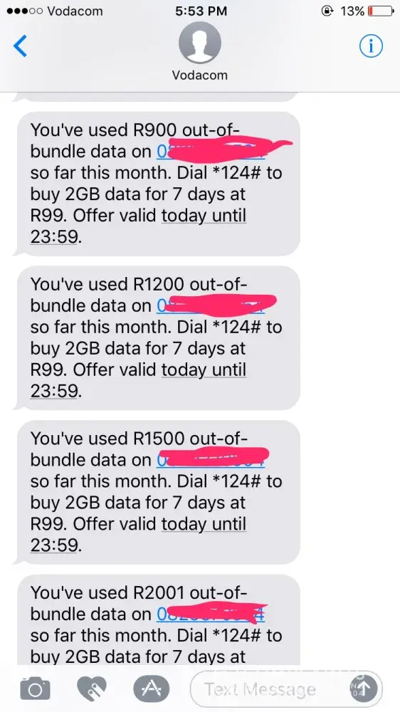 Today my first sms that I received was you have used R150 out of data bundle the time the message was send was 3:52 the next sms followed after a miute saying that ive now used R300 while I am still reading the sms the next one came and said R600 in about 5 minutes time the sms's keep on coming... it went up to R1500.. in no time!