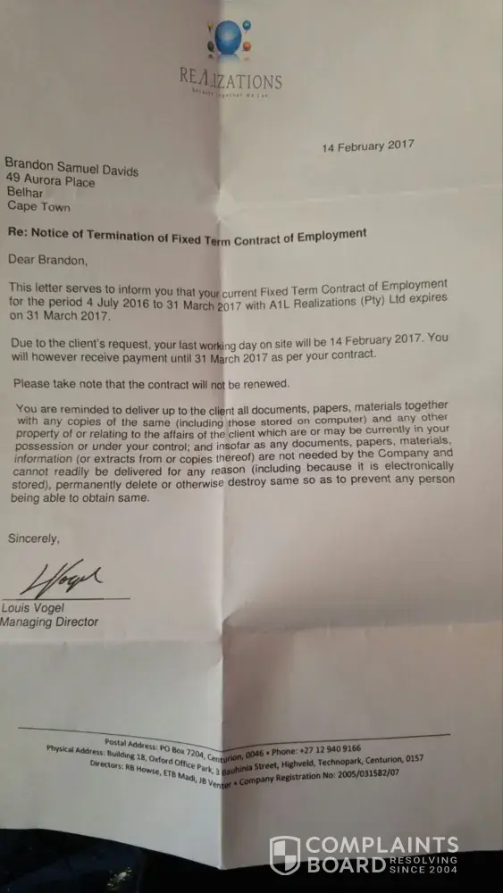 This is the worse experience of my life.A company where you get paid by a person and not automated system.A company where the Director calls you at night and threathen to terminate your contract if you speak directly to their client about their disgusting service.A company where the consulting agents dont know anything about the industry, A company where you have salary issues every month, A company where the client is much more worth then the actual agent who got the job and works for them.A company where your contract gets terminated before its expiry date without no reason given.Please see attached letter.A company where theirs no professionalism.My contract ended on the 31st of March 2017, I made them aware the director LouisVogel in particular that i was paid short for a period of four months I emailed him and his HR lady to this very hour he didnt reply.This email i sent on the 30th of March 2017 but he decided to not reply because my contract is ending the following day.I've made the very same director aware of my desire to take Fazlu Nordien who's a corrupt, fraudulent, bias individual who's the teamleader at the Vodacom CIC prepaid department to the ccma and this racist director's reply was that hes surprised at my unfounded allegations without asking his incompetent recruiting lady who goes by the name of Helga Bates who was fully aware of whats going on because she made notes and assured me that she was on my side only for her to show her true colors on the 14th of February when they asked me at vodacom to leave their premises without any reason(please see attached letter).I was informed that muslims at vodacom standby each other but i realized that late.