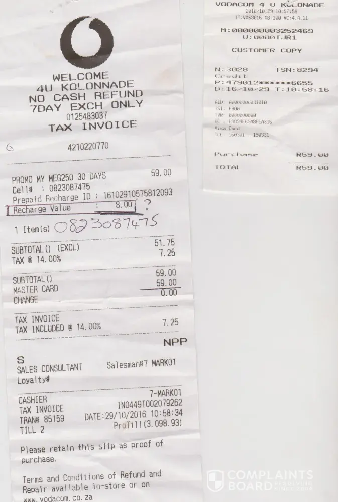 Op daardie stadium het ek nog geensins van my data kon gebruik nie. Op my koopstrokie Transaksie 85159 gedateer 29/10/2016 sien ek toe onder die Prepaid Recharge ID staan Recharge Value R8.00 terwl ek R50. betaal het. Ek het my 2 GB stiffie vir hulle gevat maar kon hulle my nog steeds nie behulpsaam wees op die 1/11/2016 nie by dieselfde winkel waar ek die R59.00 data aangekoop het nie.