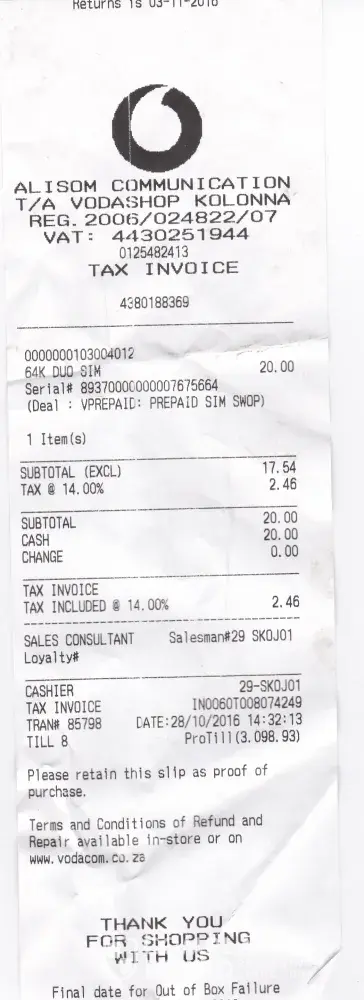On the 28th Oct 2016 I recharged my prepaid airtime with R110.00 for SIM card [protected]. My balance was then R110.55 On the morning of the 29th I received an SMS from Vodacom with this offer: Thank you for recharging. You now have R50 bonus airtime valid until 29 Oct 2016 23:59 Dial *12381# to check your offer balance. T&Cs apply. www.vodacom.co.za/123 I dialled *123*1# and got this: