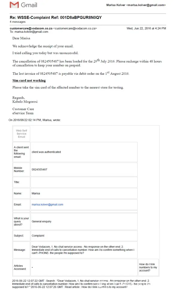 I emailed Vodacom to confirm that my contract - which had expired - would not be continued. It took multiple attempts to find a way through to them, eventually an email of complaint did the trick. I got an email back from Vodacom Customer Care. It said the following: