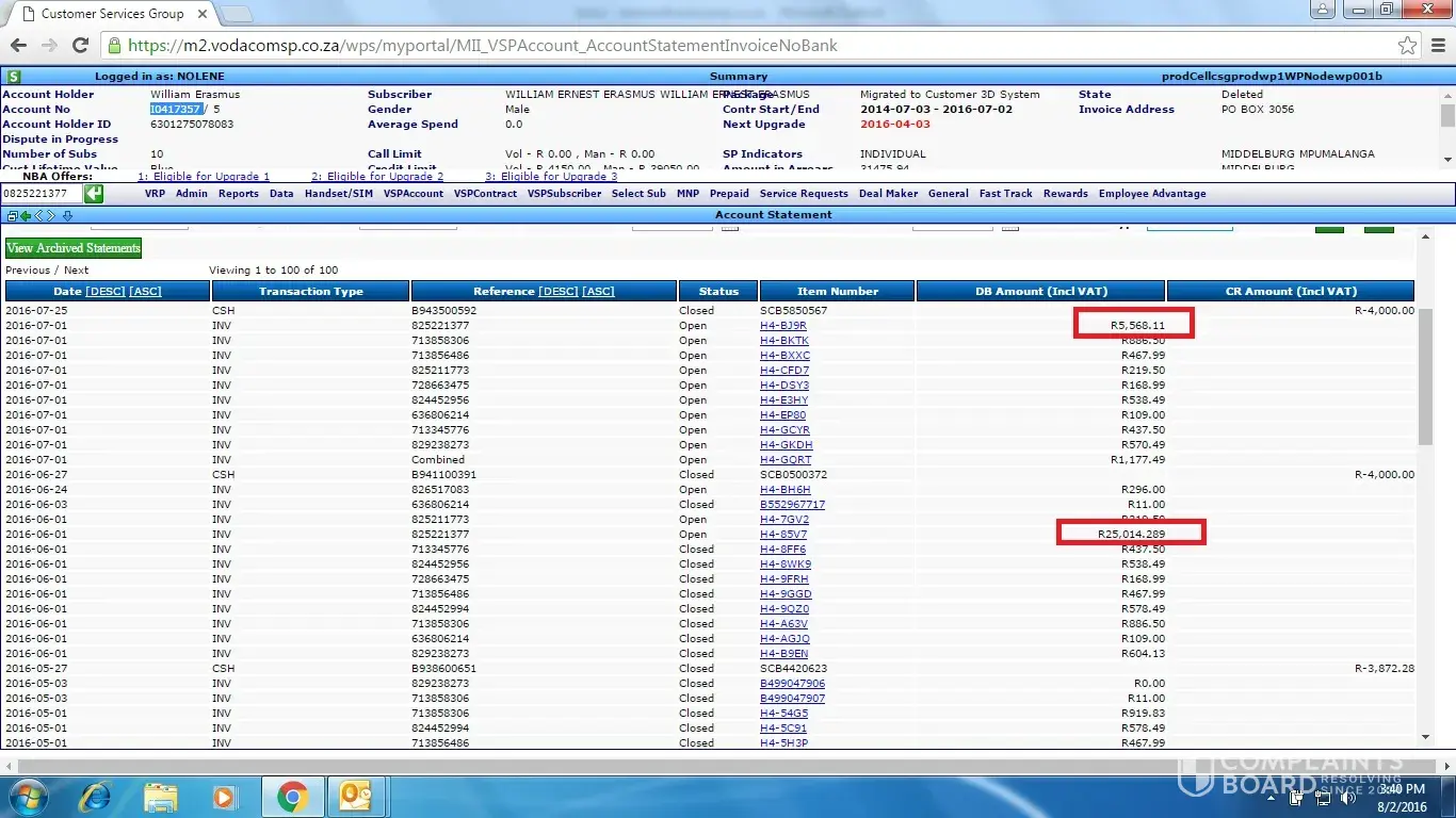 I only realised on 4 July 2016 that something was wrong. I phoned vodacom at 12h01 and they confirmed that they cancelled my main contract by accident.