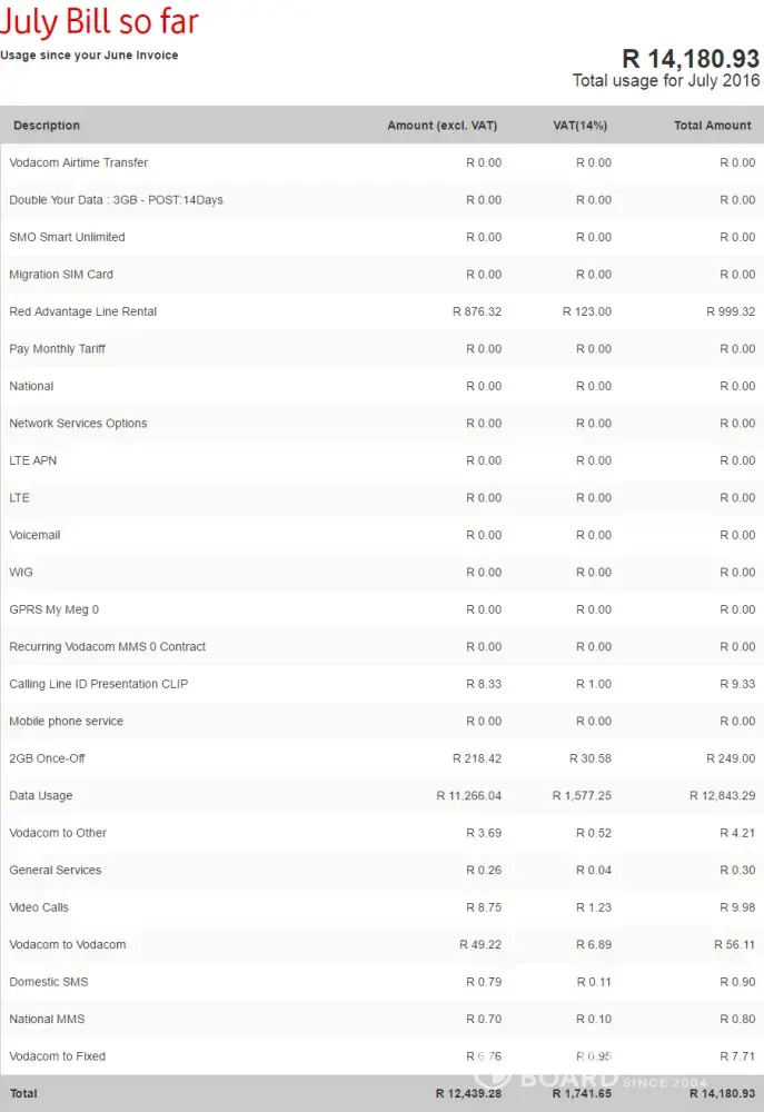 Vodacom from r1300 to r14, 180. 93 total usage for july 2016