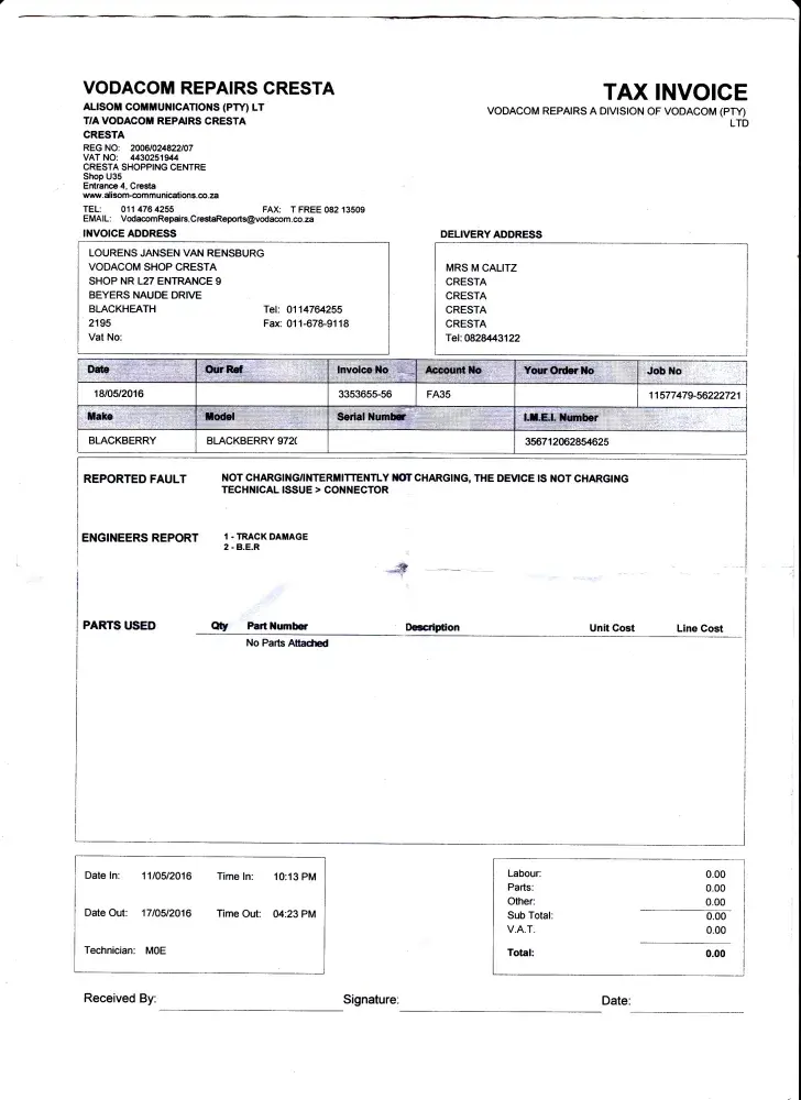 I got the Blackberry 9720 as I wanted the BIS. I have had the phone for 1 year in which I have had problems with since the first month I had it. I recently took the phone in to the repairs shop in Cresta as it was not charging anymore, I dropped it off on the 18/05/2016. I went in a few weeks later to fetch it and was told they could not repair it and the engineers report said. (1) Track damage (2) B.E.R. I was told I broke the phone. I cant see how. I was told to buy another phone. I refused and asked them to send it in again, I must buy a new phone and still pay for this broken phone for the next year. That is not fair. I have not gone to fetch the phone as i want it repaired or swapped out.. My repair number is [protected].