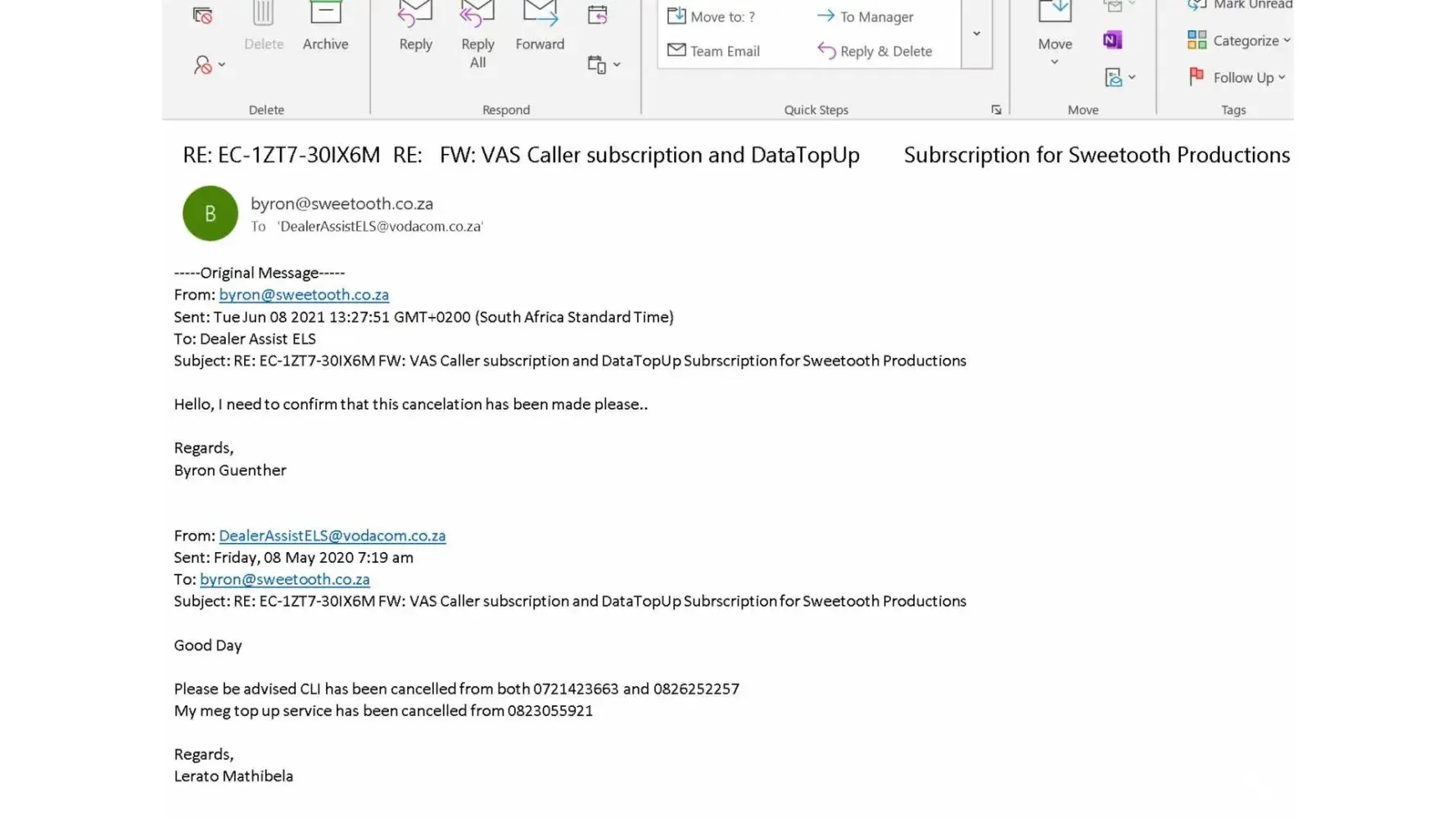In October 2021 I contacted Vodacom and requested a premature cancellation quotation for an existing contract. This was emailed to me on the 21st October, 2021. I took this quote and paid at a Vodacom store for the amount of R1149.00 on the 28th of October, 2021. I emailed the signed quotation, proof of payment as well as my Identity document to early [protected]@vodacom.co.za on the 29th October, 2021.