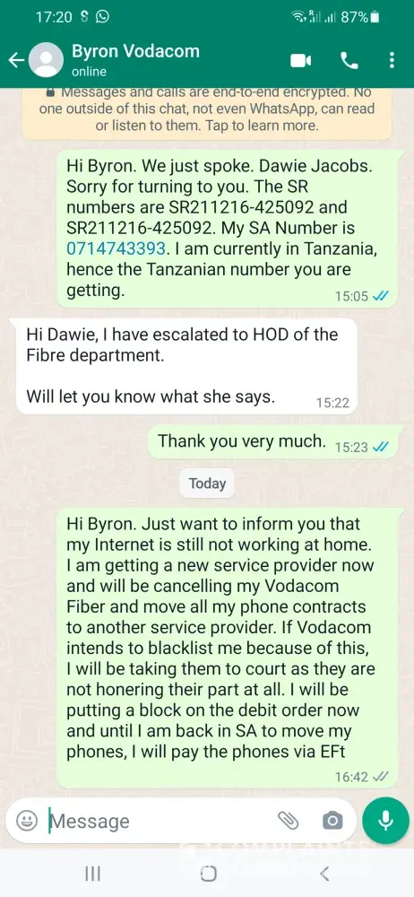 I was told to email the Vodacom online manager, Kelly Phillips. I sent 3 emails to her, no response. I tried to phone again and was told she'll phone me back, I am still waiting.