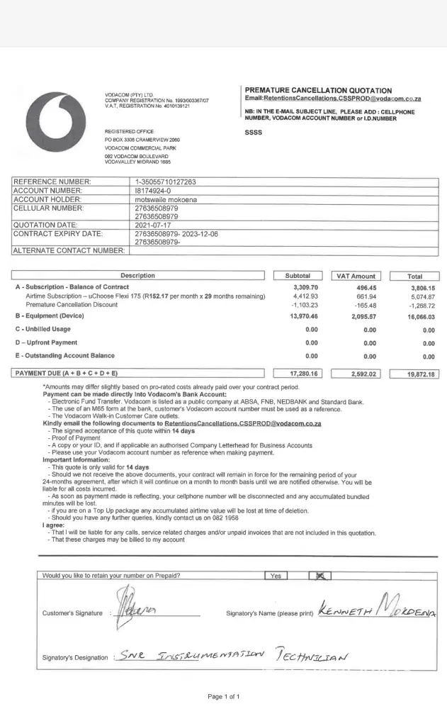 Desired outcome: To be able to cancel my Vodacom Fibre Contract