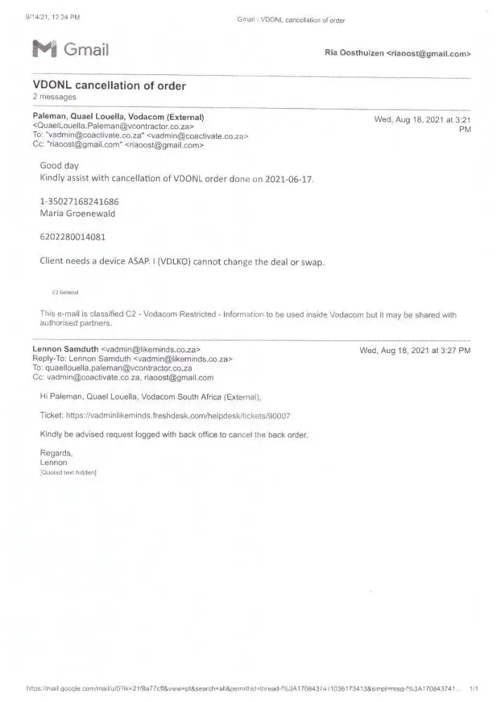 Desired outcome: I want Vodacom to honour their confirmation of my new contract and deliver the device as confirmed by them.