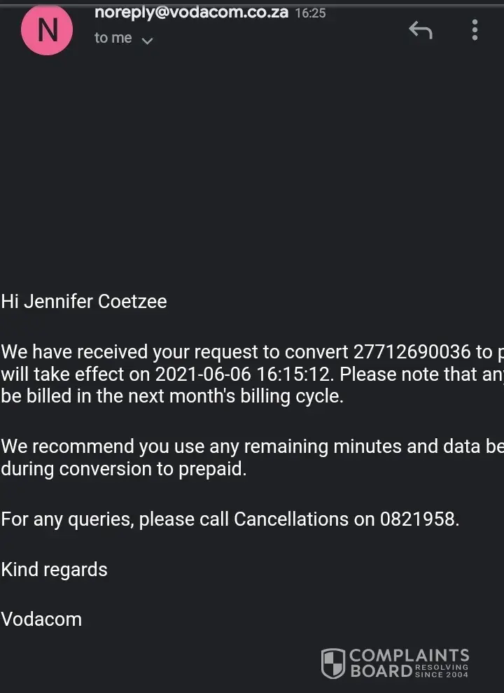 I have been trying to cancel one of my Vodacom contracts since the 29th April 2021 - when it was due to expire. I have phoned the' cancellations Department' 15 times, spoken to different consultants, and they could see from the records I had phoned numerous times, and to date, no cancellation seems to have been done. I have received two e-mails saying that it has been logged to prepaid and will take effect with from 11.05.2021. Yesterday, another e-mail received, which is the same as the previous one with the date now 06.06.2021. I went into a Vodacom Store and they confirmed it has been cancelled.