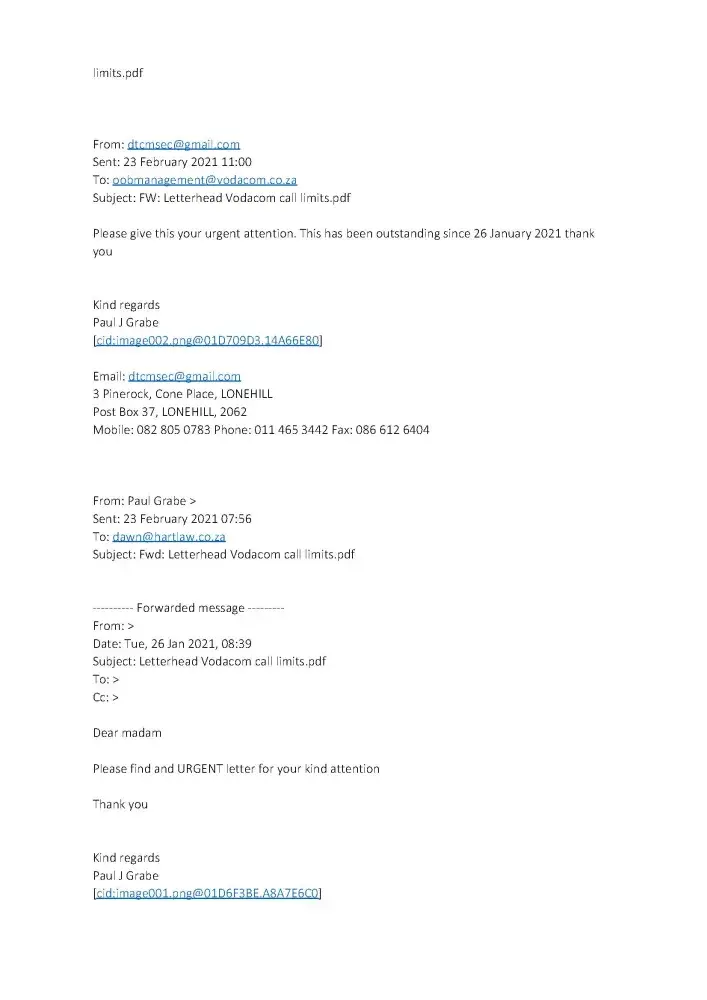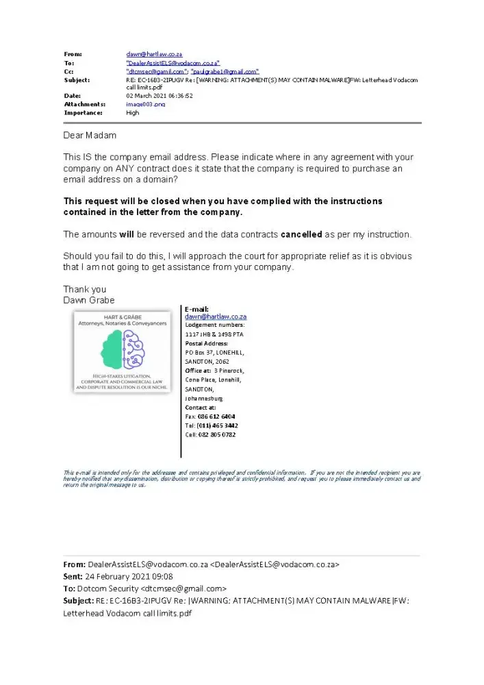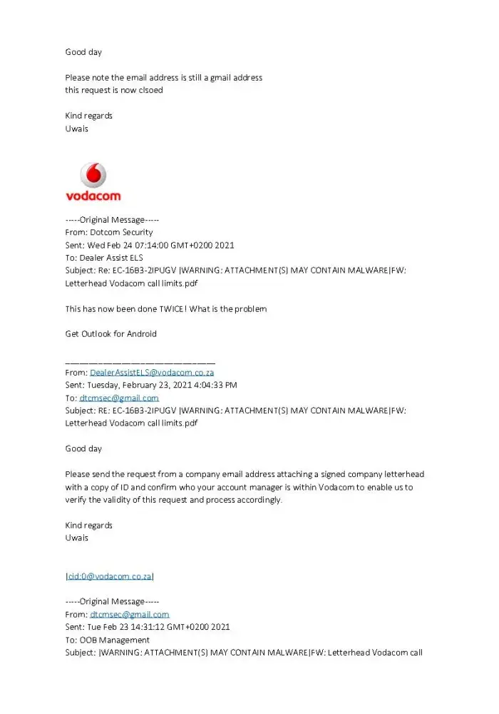 I on the 26th Jan 2021 requested a call limit to be placed on two numbers. I was told to send the instruction on letterhead and copy of ID. I was told to send it from CO email. I did. Got reply that a gmail address is not a CO email address and my query is CLOSED. I emailed back that it is not acceptable and no requirement that domain be purchased to obtain a non-gmail account. Both the above numbers were disabled. Both numbers are attached to business which had to halt as a result of the malicious actions of the staff. The person involved in the emails are a Uwais from this email address: [protected]@vodacom.co.za. This was no accident that the lines suddenly no longer work and the instruction could not be misunderstood.