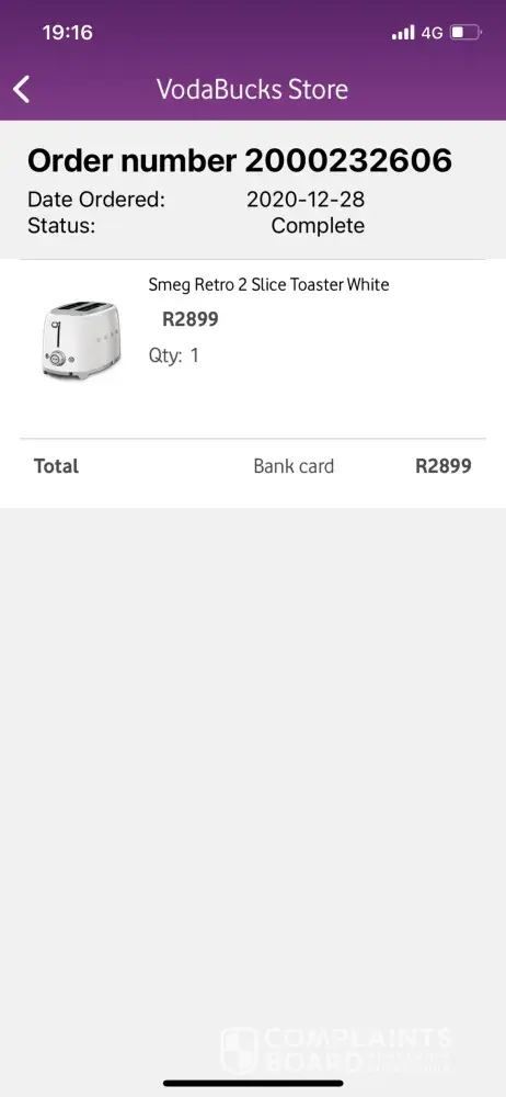 On the 28 December 2020, I made a purchase of a SMEG TOASTER on your Voda bucks store. The price of the toaster was R2899.00. I paid it through my credit card. I didn't include any Vodabucks.