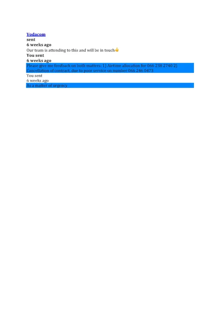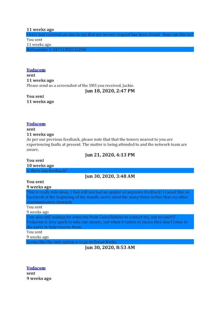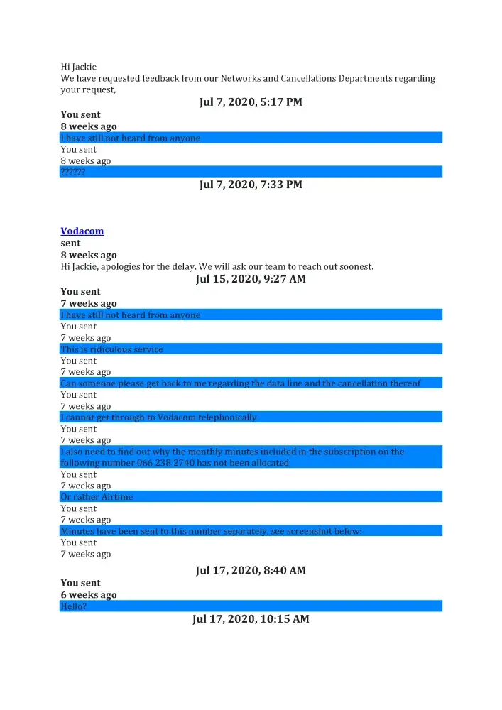 This started on the 16th July at 10:18 when I first called vodacom to advise them that they had not debited my account and that I needed an invoice. I spoke to a consultant Amanda stating she would log a call with finance and that I should make a manual payment in the interim just to make sure my fibre was not cut. so she logged 2 references one to generate an invoice and the other to fix the debit order as she said that it was cancelled as I requested a cancellation quote in april