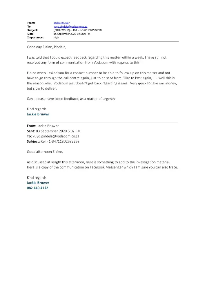 The problem with this line was not fixed. I was unable to get through to Vodacom to try and sort out the problem or follow up on the call logged or "investigation into the problem", I am not sure if it was due to COVID but you couldn't get through to the call centre and after holding for almost 30 minutes the calls were disconnected. Not being able to get hold of anyone, I took to social media and made a post on Vodacom's facebook page, please refer to screenshot of post made on Facebook. It wasn't long before I got a response on Facebook messenger, but this was also in vain because nothing came of this effort. I am unable to attach the Facebook Messenger communication but will gladly email it to someone for review.