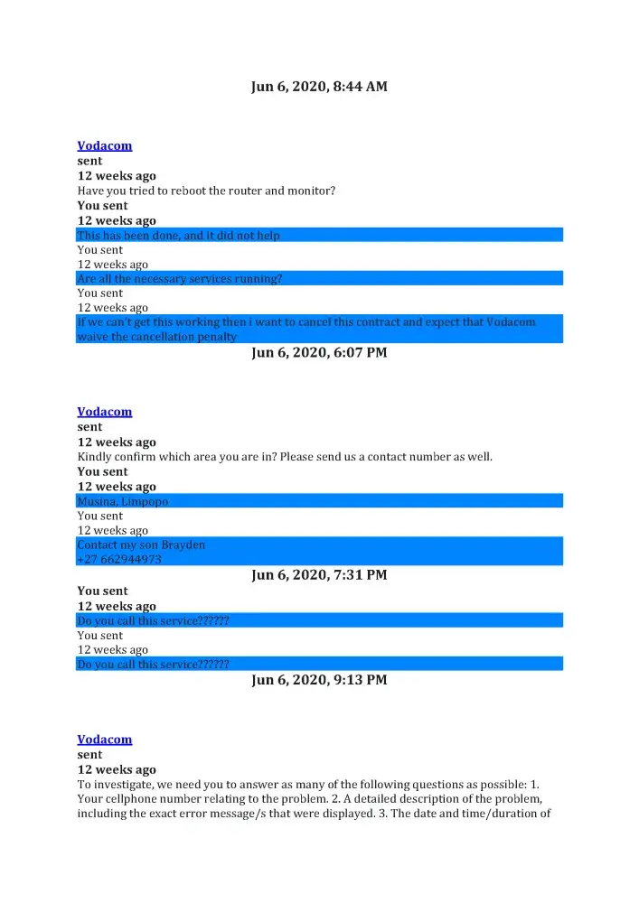 I took out at 50GB data line with router from Vodacom, which my two sons were meant to use in Musina Limpopo. Over this period of time we have logged numerous calls because this line has been intermittently available. Unfortunately I never thought it would amount to this so I have not kept reference of all of these calls that were logged, but I am sure that Vodacom should have some record of all the calls.