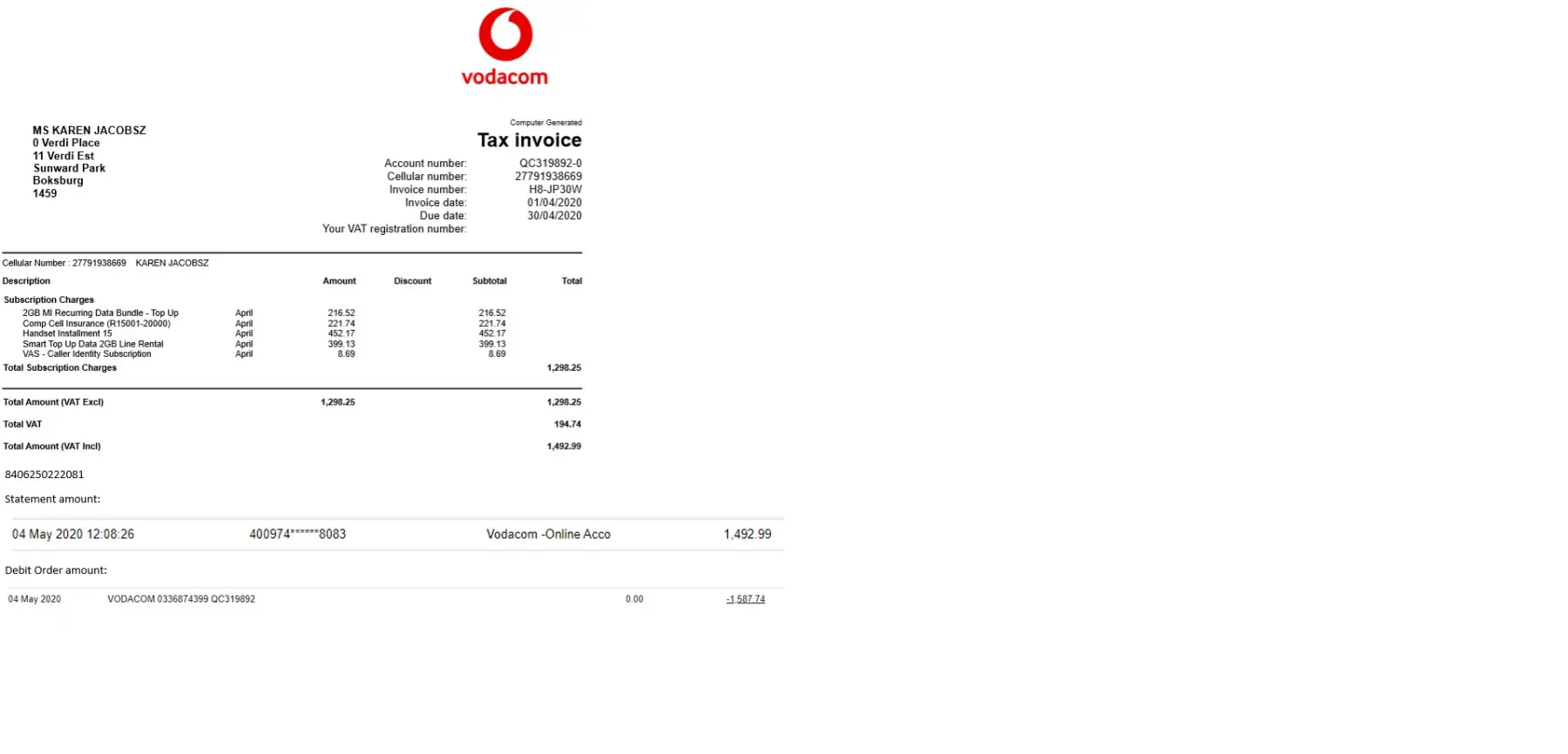 I received a call from Vodacom 04.05.2020 ([protected]) advising that my account is in arrears, and I made payment. Last night my debit order also went off, this is not acceptable. How can you expect me to pay my account and the debit order goes off, also my statement amount and debit order amount differs totally. Please rectify asap!